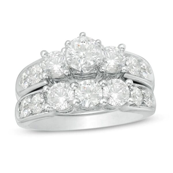 On the day you ask for her hand in marriage, honor her with a three stone diamond bridal set that honours love. Exquisite in 14K white gold, the engagement ring dazzles with three round diamonds as its focus.And two small round diamonds complete the look. On your wedding day, complete the ensemble with the coordinating wedding band, which also features three round diamonds flanked by round stones set into the shank.t.w. of diamonds and a polished shine.