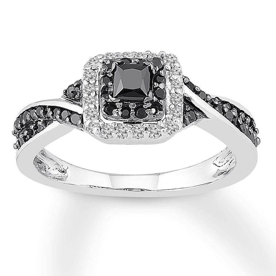 This fabulous ring for her features a princess-cut black diamond. Round black diamonds sweep along the band and frame the center to complement, while sparkling round white diamonds add the finishing touch. The sterling silver ring has a total diamond weight of 3/8 carat. Black diamonds are treated to permanently create the intense black color.